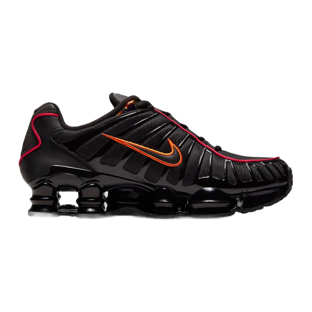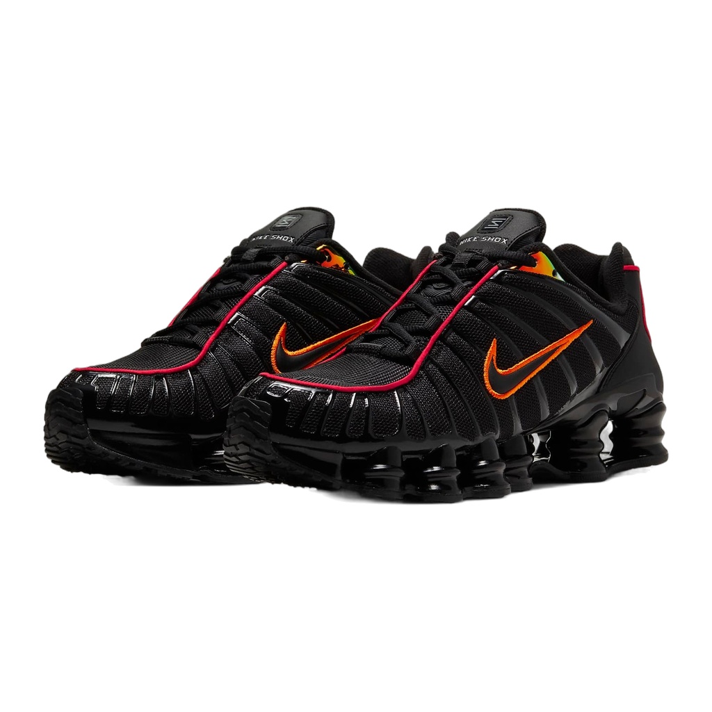 Opis: Brutalna kombinacija koja podseća na originalne Tn „Tiger“ boje, ali na Shox platformi. Dominira crno gornjište sa sjajnim rebrima, dok su Shox stubići (opruge) i detalji na jeziku i peti izvedeni u jarkoj Orange (narandžastoj) boji. Ovaj kontrast daje patici agresivan, „vatreni“ izgled, dok sivi i srebrni reflektujući detalji na Swoosh logotipu upotpunjuju ovaj legendarni ulični stil.