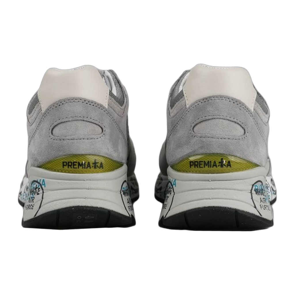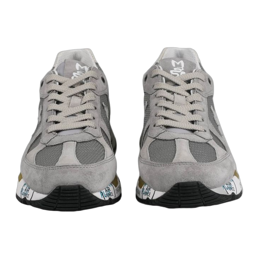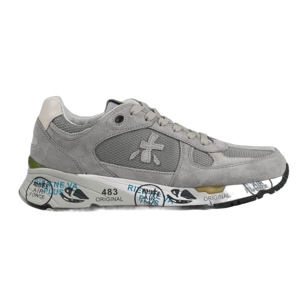 Opis: Ovaj model iz serije Mase donosi smireniju, ali veoma luksuznu estetiku u različitim nijansama sive. Gornjište je majstorska kombinacija rupčićastog tehničkog platna (mesh) koje omogućava odličnu ventilaciju i vrhunskog prevrnutog antilopa koji daje dubinu dizajnu. Prepoznatljivi Premiata logo sa strane je diskretno uklopljen u istoj boji, dok maslinasto-zeleni prozirni detalj na peti dodaje jedini suptilni kontrast. Đon je u beloj boji sa karakterističnim crnim i plavim natpisima, čuvajući autentični italijanski identitet.
